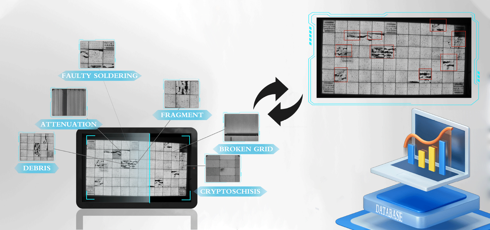 可檢測(cè)識(shí)別缺陷類型:隱裂/斷柵/裂紋/破片/邊緣過刻/碎片/黑心/黑邊/短路/燒結(jié)網(wǎng)紋/材料缺陷/低效率片/失配/衰減/熱斑效應(yīng)/PID..